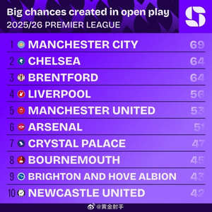以下为本赛季英超球队运动战创造重大机会榜: