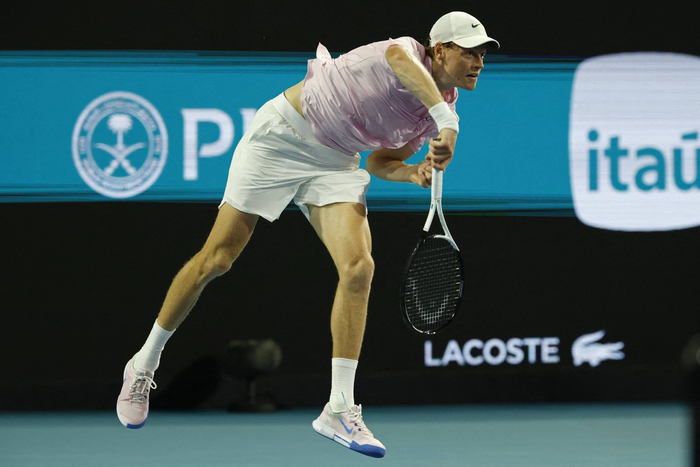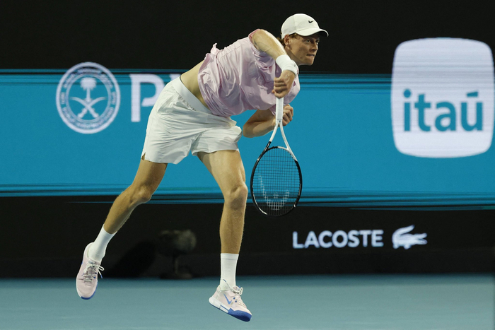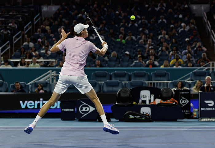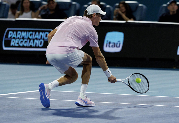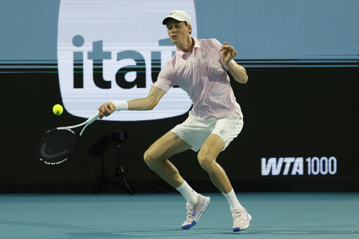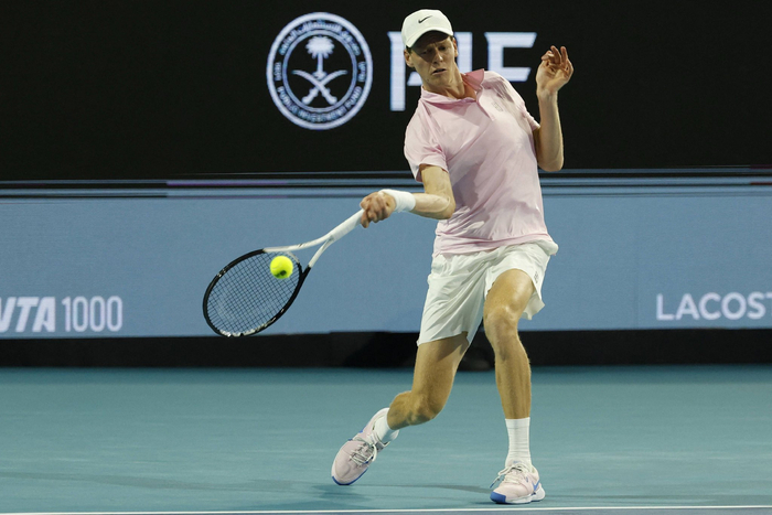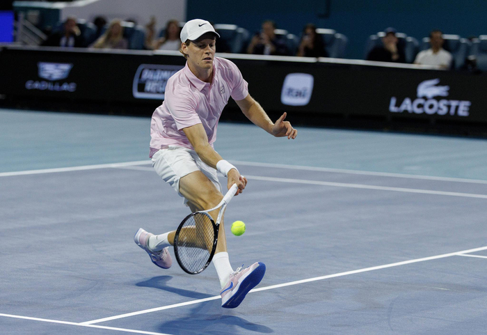 3月23日,辛纳在比赛中回球。 新华社/路透