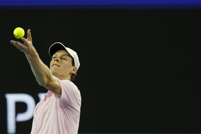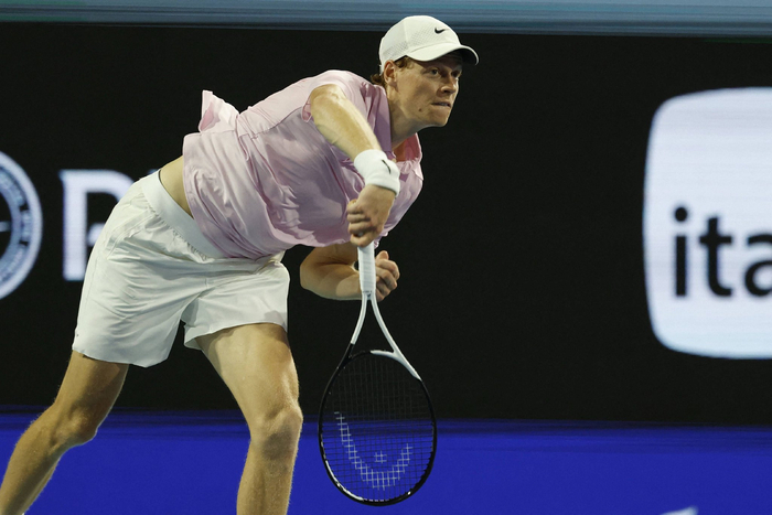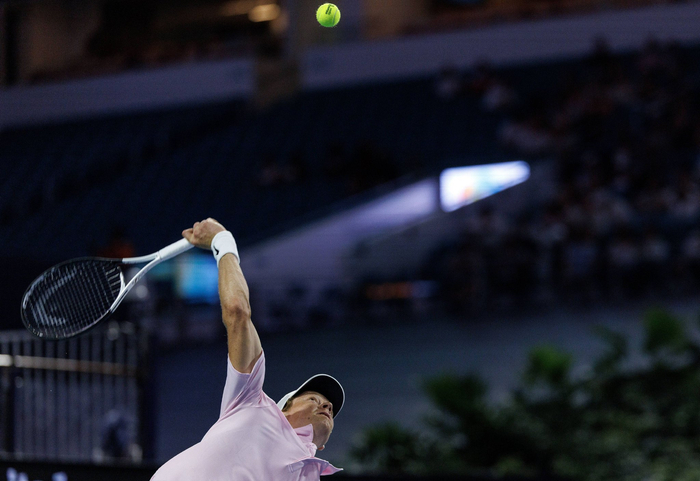 3月23日,辛纳在比赛中发球。 新华社/路透