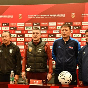 24日,中国U23男足主教练安东尼奥(左二)和2026西安国际青年足球锦标赛其他参赛队的主教练们在赛前发布会上。