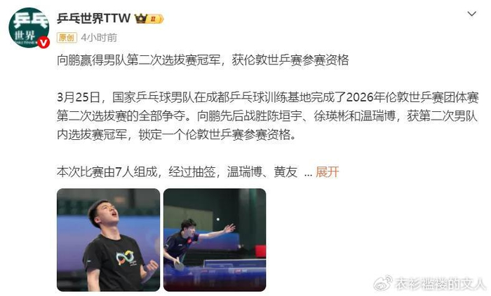 重磅消息!不久前,国乒男队在成都乒乓球训练基地完成了2026年伦敦世乒赛团体赛第二次选拔赛的全部争夺。前些日子,国乒男队进行了第一次的选拔,当时周启豪突出重围,成为拿到入场券的选手。这一次的选拔是最后一次选拔了,因为算上这一个名额,国乒男队理论上的参赛名额已经拉满了。在伦敦团体世乒赛上,每一支参赛队伍的球员上限是5名,而王楚钦、樊振东、林诗栋、周启豪已经就位。