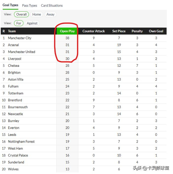 首先,阵地战失球数,占总失球数的比例,只有狼队的比例超过了30%。甚至,曼城、阿森纳、切尔西的阵地战失球比例,低于10%。这说明了什么?在英超想要玩阵地战进攻,已经越来越难破门了,换句话说,阵地战进球,就不是英超球队的主要进攻方式,所以也就不奇怪阿森纳玩起了定位球进攻战术。目前,英超20支球队只有4支球队的阵地战进球数超过了30球,也就是说,阵地战进球数能达到场均1球的,只有4支球队不到而已。
