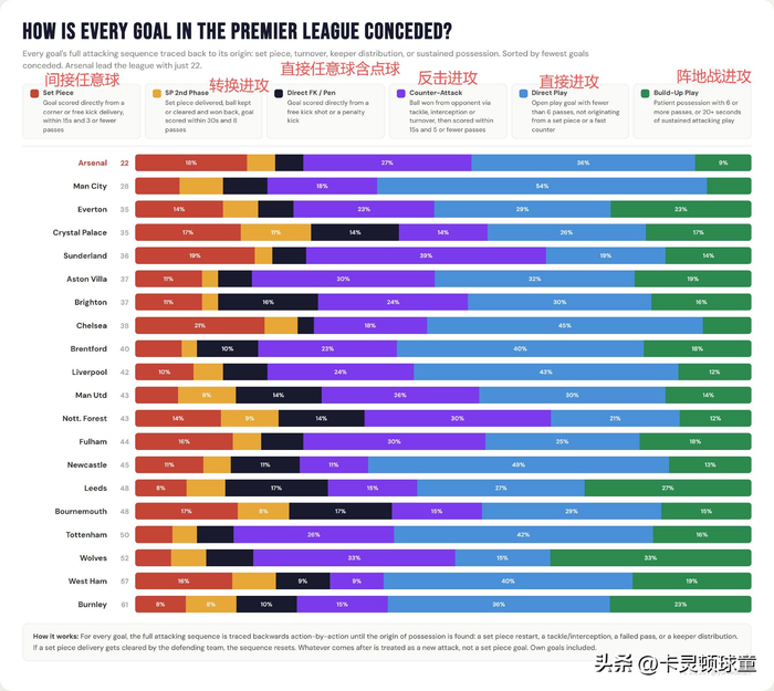 接着,英超20支球队,因为反击+直接进攻造成的失球总比例,超过了50%。这里说的直接进攻,是指从后场拿球之后,传球次数少6次(且不是定位球+反击)的进攻组织。某种意义上,你可以认为是大脚开到前场,或者后场快速的一脚传递通过中场,从而形成的射门机会。