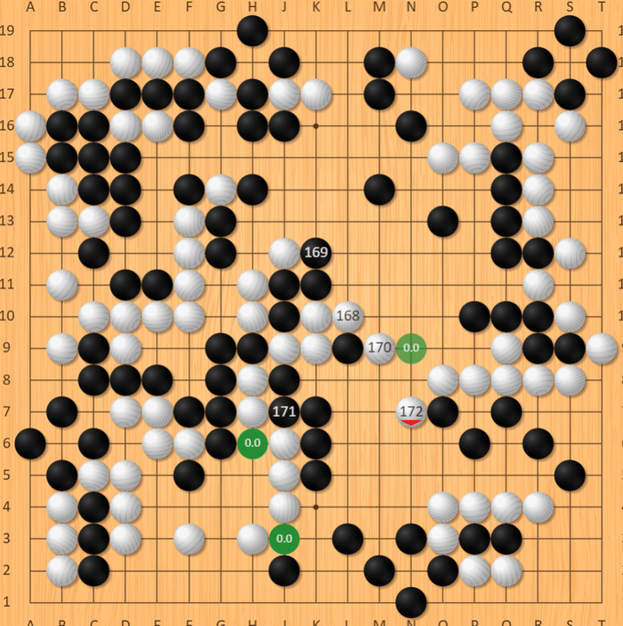 本局比赛,刘宇航执黑先行,序盘阶段右上第12手的小尖出现明显失误,导致从序盘到第60手,黑棋始终处于亏损状态,胜率持续走低。中盘阶段,刘宇航试图在中下区域扭转局势,但未能取得有效进展,王星昊则凭借精准的判断和稳定的发挥,百余手过后便基本锁定胜局。