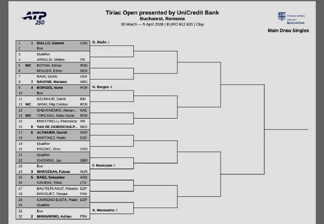 ATP250罗马尼亚布加勒斯特站的单打签表也新鲜出炉。迪亚洛、马纳里诺、马洛桑、博杰斯位列前四号种子,布斯塔、阿古特、巴埃斯等名将也将参赛。
