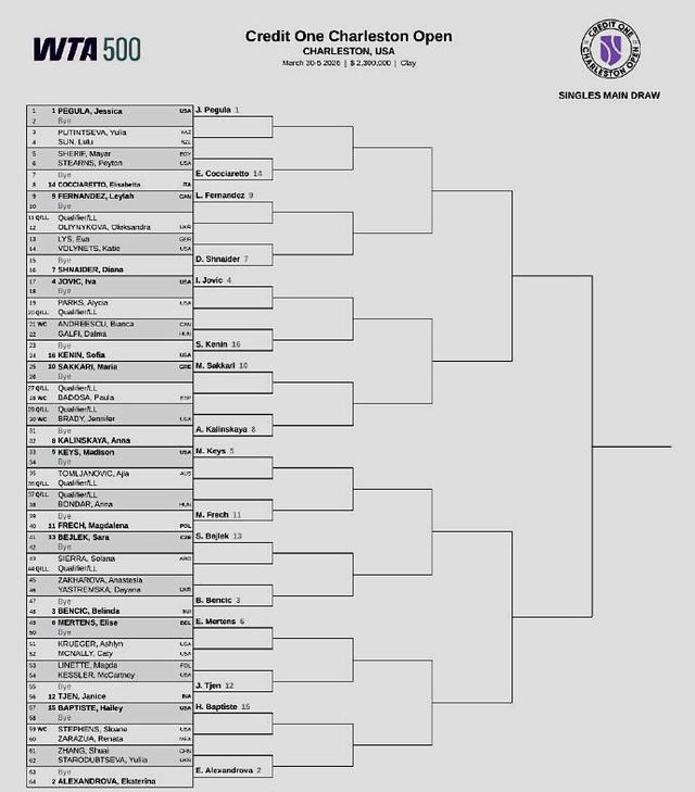 我们再来关注下周赛事。北京时间昨晚,WTA500查尔斯顿站公布了正赛签表。卫冕冠军佩古拉和亚历山德洛娃、本西奇、约维奇、凯斯、梅尔滕斯、施耐德、卡林斯卡娅等名将新星出战,位列前八大种子。中国老将张帅马不停蹄,继续双线出战。她单打首轮对阵斯塔罗杜布采娃;双打与克鲁尼奇搭档,首轮对阵苏加迪/曾丽美。