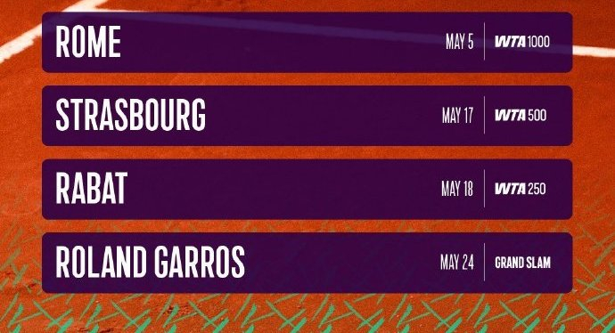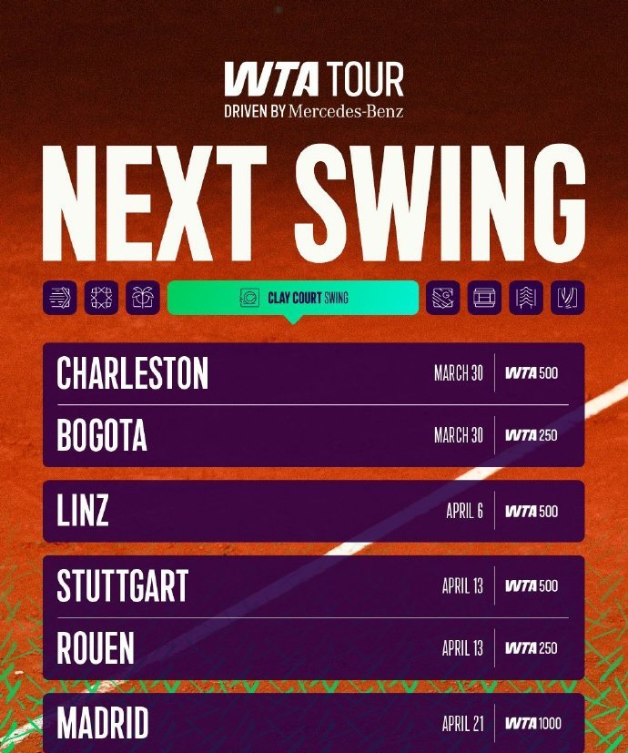 我们再来关注其它消息。北京时间昨晚,WTA官宣了今年红土赛季的赛历。这份赛历从3月底开始,一直到6月上旬,其中包括三站250赛、四站500赛和两站1000赛,最后是大满贯赛的法网。具体赛事安排,附图里有详细内容,球友可点击放大观看。