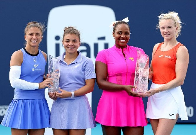 女子赛场:在WTA1000迈阿密站双打决赛中,2号种子、捷美组合西尼亚科娃/汤森德发挥出色,以7-6(0) 6-1击败头号种子、意大利强档埃拉尼/鲍里妮,携一波10连胜背靠背捧杯,解锁了“阳光双冠”。恭喜她们!