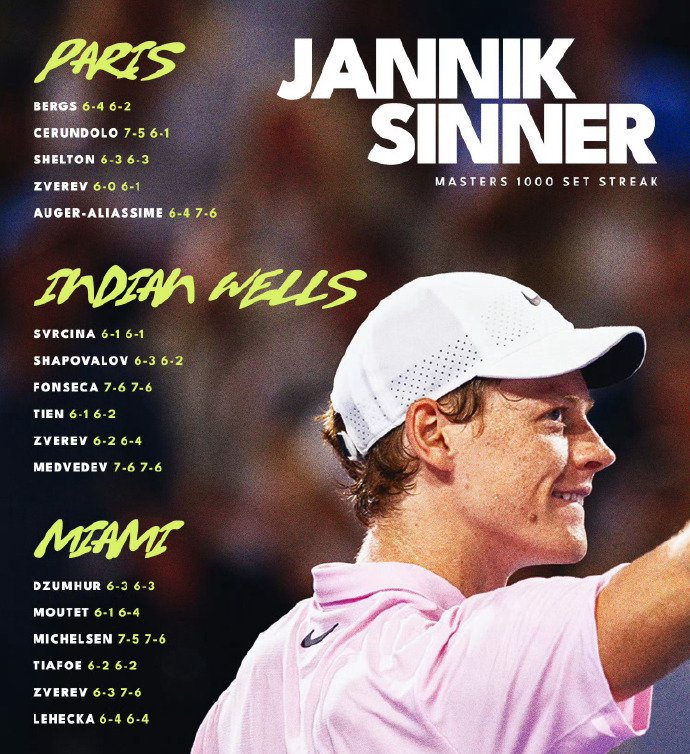 这是辛纳获得的第7个大师赛冠军、第26个单打冠军。同时,辛纳也刷新了多项纪录。这是他在大师系列赛上获得的34盘连胜,大幅领先排在第二位的德约科维奇(24盘),高居榜首;他还是第8位在同年包揽“阳光双冠”的男子球员,比肩考瑞尔、张德培、桑普拉斯、里奥斯、阿加西、费德勒、德约科维奇等前辈,而且他还是历史上首位不失一盘拿下“阳光双冠”的人,创造了新纪录。