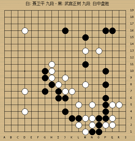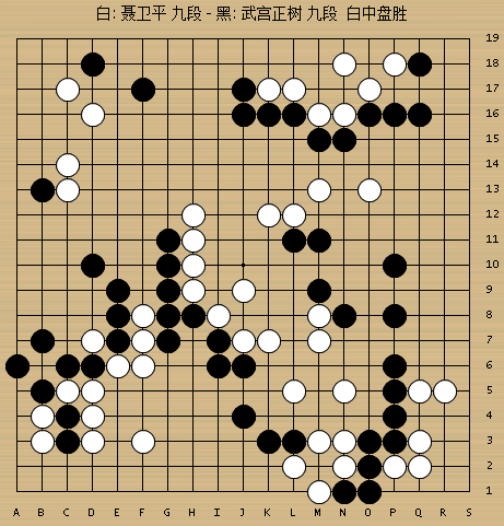 此外,武宫先生在擂台赛之前与聂卫平有过四次交锋,全部获胜,其中距离最近的一局是1986年的中日对抗赛。当时聂卫平已经在首届中日擂台赛上连破小林光一、加藤正夫、藤泽秀行,但1986年那次访日,他先是在三番胜负中1比2遭加藤正夫逆转,又在与武宫正树的交锋中执黑3目半告负,仍感受着超一流棋手的强大压迫力。