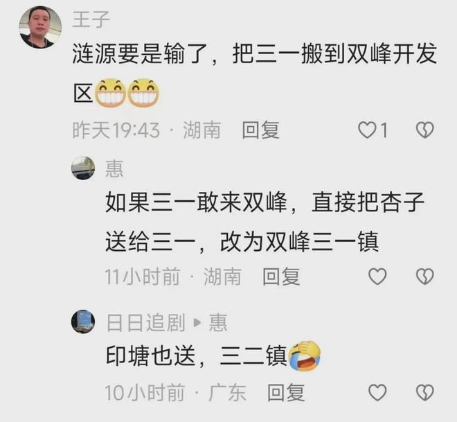 网友调侃“这哪是要合并一个镇,这是要把娄底的半壁商业江山都端走”。还有网友跟着起哄:三一要是来双峰了,杏子、印塘都可以送了,直接改叫三一镇、三二镇!一来一回的互怼,没有半分火气,全是娄底人特有的傲娇和幽默,主打一个“气势上绝对不能输”。