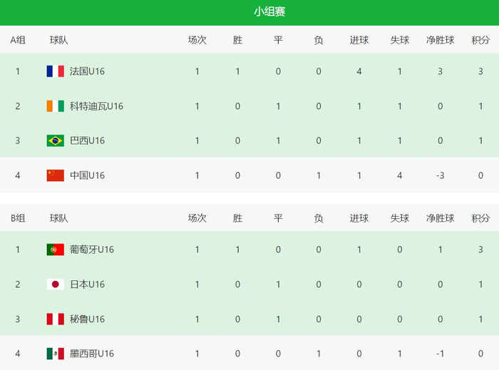 A组方面,法国队积3分暂居第一,巴西队和科特迪瓦队同积1分,并列第二,中国队积0分暂居垫底。