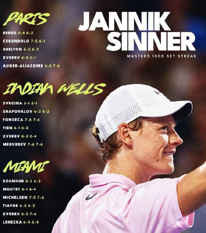 辛纳跨赛季连夺巴黎、印第安维尔斯和迈阿密三站大师赛冠军,位列男子网坛历史第二,仅次于西班牙战神纳达尔、塞尔维亚天王德约科维奇曾经创造的的大师赛四连冠。辛纳连夺北美“阳光双赛”冠军,成为男子网坛历史第八人,比肩美国传奇考瑞尔、张德培、桑普拉斯和智利独狼里奥斯、美国传奇阿加西、瑞士球王费德勒、塞尔维亚天王德约科维奇。更加令人叹为观止的是,辛纳创造了跨赛季大师赛34盘连胜的新纪录,成为ATP1990年设立大师赛以来历史第一人,远超历史第二人德约科维奇的24盘连胜。