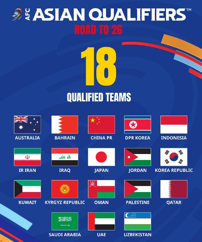 此前晋级18强赛的球队,包括中国、日本、澳大利亚、沙特阿拉伯、巴林、印度尼西亚、伊朗、卡塔尔、乌兹别克斯坦、阿联酋、吉尔吉斯斯坦、朝鲜、韩国、伊拉克、约旦、阿曼、巴勒斯坦、科威特,早早直通亚洲杯正赛,还剩下6个名额通过预选赛阶段产生。