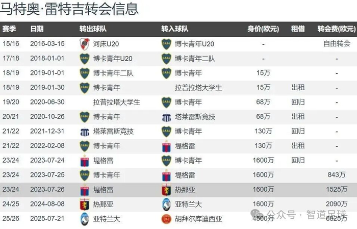 雷特吉出自博卡青年青训,球员于2023年夏窗以1525万欧元的转会费转战意甲加盟热那亚,也选择代表意大利出战,因为他没有信心能入选阿根廷国家队。雷特吉在意甲发挥出色,2023-24赛季代表热那亚意甲29次出场,贡献7球2助;2024年夏窗以2090万欧元转投亚特兰大,2024-25赛季意甲36场25球8助,夺得金靴;2025年夏窗,亚特兰大立马以6825万欧元的转会费将雷特吉卖给沙特超球队胡拜尔库迪西亚,就此开启淘金生涯,球队和球员算是双赢。