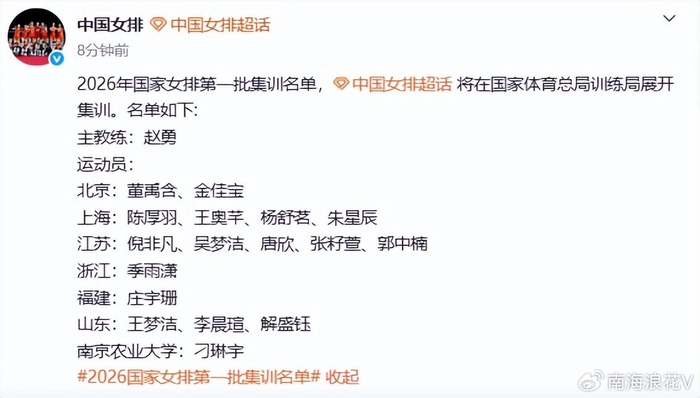中国女排超级联赛,随着上海队的夺冠而降下帷幕。在联赛结束之际,中国女排公布了2026年的集训名单,主教练仍然是赵勇,集训名单一共有17人,他们是:
