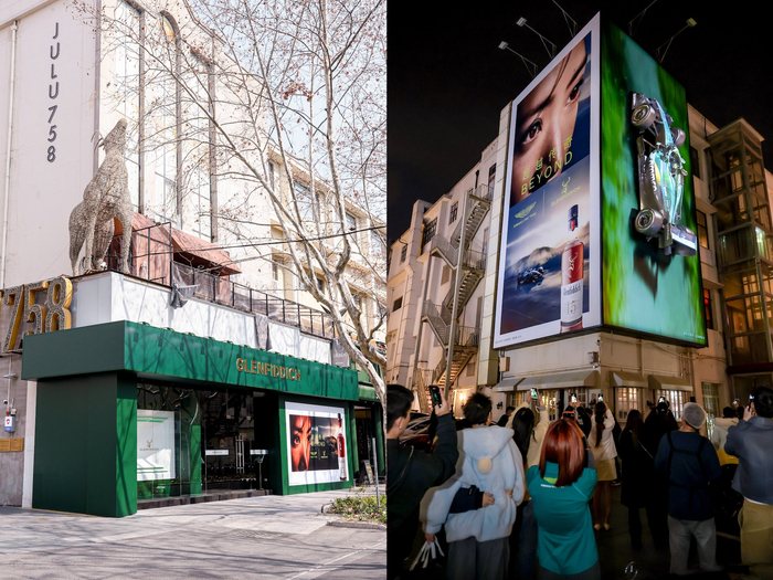 不仅如此,格兰菲迪更在上海市中心的巨鹿758创设“超越传奇”限时快闪体验空间,沿袭相同理念,把F1®团队协作的元素融入品饮情景。巨鹿路的外墙更背焕新打造成为三维车模,切换不同的光影效果展现赛场上的速度与激情,和一众威士忌爱好者及F1®赛车迷于此建立超越当下的情感链接。