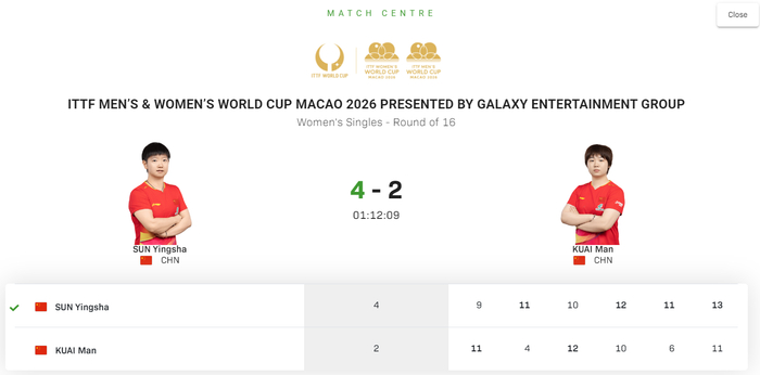 鏖战73分钟的六局大战才迎来了最终章,孙颖莎4-2蒯曼晋级八强,六局比分:【9-11,11-4,10-12,12-10,11-6,13-11】,时隔19天复仇蒯曼。