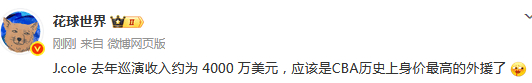 J.cole 去年巡演收入约为 4000 万美元,应该是CBA历史上身价最高的外援了