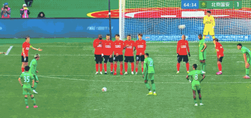 第65分钟,国安获得前场任意球,张稀哲的射门绕过人墙,砸在球网上方,差之毫厘。