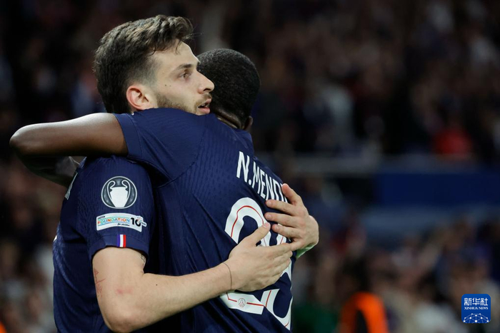 4月8日,巴黎圣日耳曼队球员克瓦拉茨赫利亚(左)在进球后与队友门德斯庆祝。