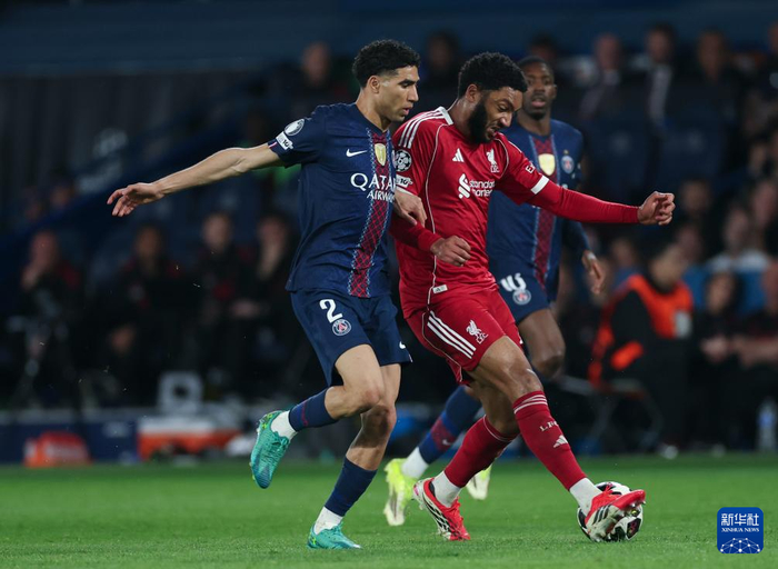 4月8日,巴黎圣日耳曼队球员阿什拉夫·哈基米(左)和利物浦队球员乔·戈麦斯在比赛中争抢。