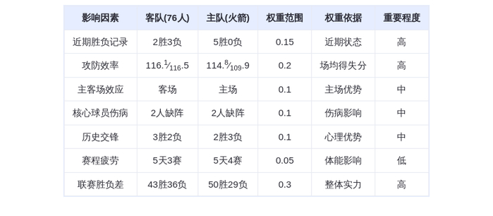 综合分析各项因素,火箭在主场优势、近期状态和篮板球方面占据明显优势,而76人则在内线得分和防守上略胜一筹。考虑到火箭近期火热的状态和主场作战的优势,我们预测: