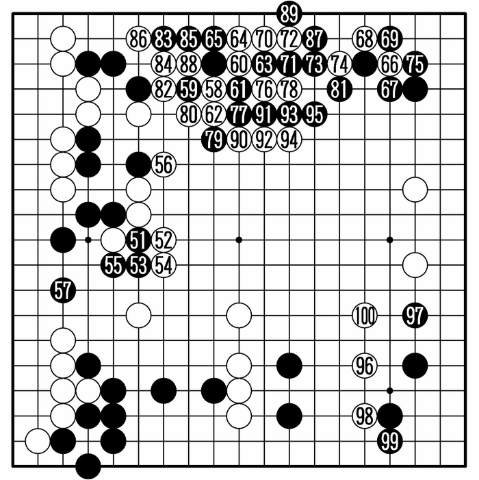 白70以下是赵治勋苦心的运转。而白80大概是连大竹英雄也未曾料到的好手。虽然黑81到黑95看似一本道,但白棋不仅在左上获利,中央也变得异常厚实,形势立刻逆转。