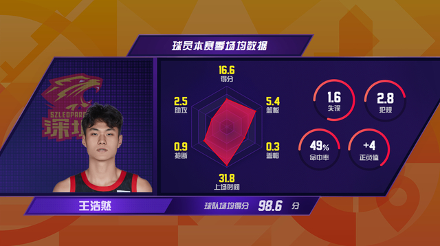 本赛季常规赛36场比赛,王浩然保持全勤,场均16.6分创个人生涯新高,排在联赛本土球员第5位,场均5.4板2.5助均为职业生涯最高的一季。49%的投篮命中率、37.8%的三分命中率和76.4%的罚球命中率全部为职业新高。