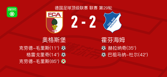 北京时间4月11日德国足球顶级联赛 联赛 第29轮,奥格斯堡主场对阵霍芬海姆。奥格斯堡克劳德-毛里斯破门,格雷戈里奇破门。霍芬海姆赫拉纳奇破门,巴祖马纳-杜尔破门。最终比分奥格斯堡 2-2 霍芬海姆。