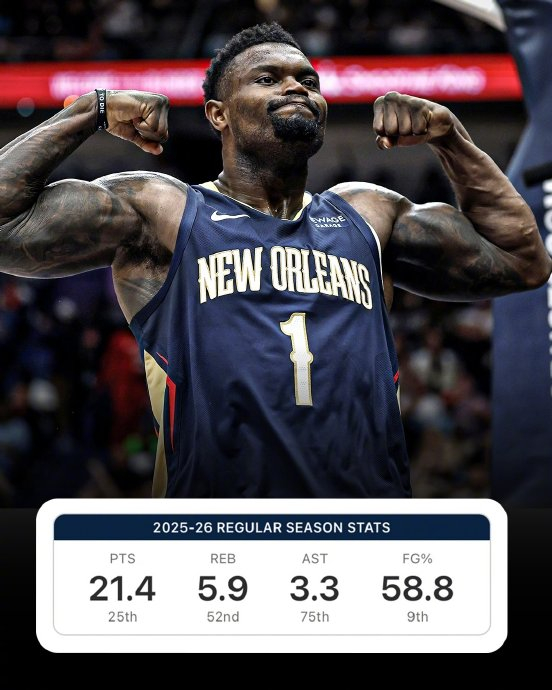 出勤率触目惊心:截至2026年4月,锡安职业生涯常规赛出战不足250场,缺席场次却高达270场,生涯出勤率定格在45.3%。2019年以状元身份进入NBA后,他从未完整打完一个赛季:新秀年仅24场,2021-22赛季因右脚骨折报销,2024-25赛季再因腿筋和背伤只打30场。