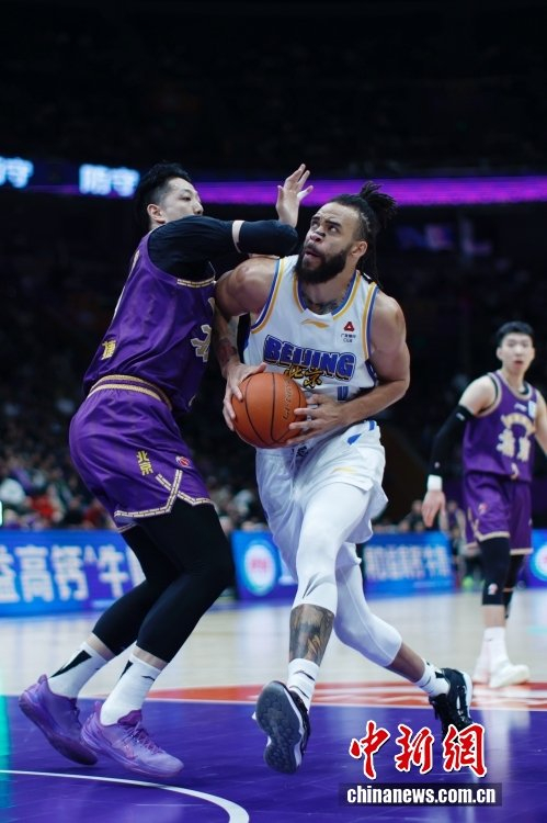 4月10日,在北京国家体育馆举行的2025-2026赛季中国男子篮球职业联赛(CBA)常规赛比赛中,北京控股队主场65比84负于北京北汽队。图为北京控股队佩里(左一)在比赛中防守。中新社记者 韩海丹 摄