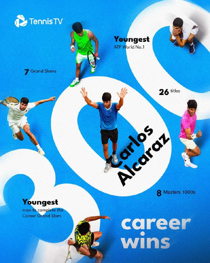 职业生涯打了367场比赛,获得300场胜利,阿尔卡拉斯追平麦肯罗最快实现300胜纪录,并列公开赛年代第三位。22岁的西班牙人,再一次把自己写进了最年轻纪录的史册。