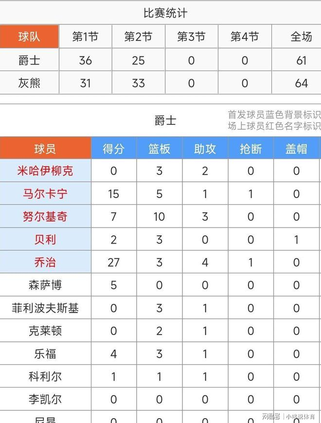 第一节开打,莫兰特迎着对抗打进2+1,基昂特.乔治外线冷箭怒射3分命中,马尔卡宁同样大手一挥3分稳稳入网,韦尔斯外线博得杀伤罚球三罚全中添3分,两队开局6:6战平。双方陷入对攻模式杀的风生水起,首节结束爵士队36:31领先灰熊队5分。