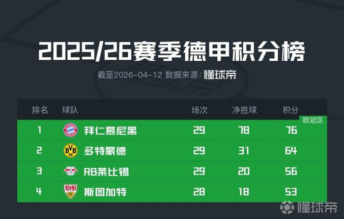 本轮德甲,拜仁5-0大胜圣保利,打破了德甲球队历史单赛季进球纪录,而多特蒙德0-1不敌勒沃库森。这意味着两队的积分差距来到12分,在联赛仅剩5轮的情况下,只要下轮拜仁能相对多特取得积分优势,就将提前4轮确定本赛季德甲冠军。