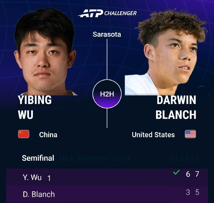 我们首先来关注中国一哥吴易昺。在北京时间昨晚进行的ATP挑战赛萨拉索塔站半决赛中,吴易昺发挥稳定,以6-3 7-5击败18岁的美国小将布兰奇,顺利晋级决赛。