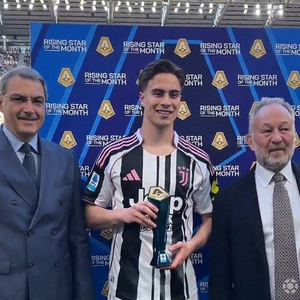 北京时间4月6日,在意甲第31轮尤文图斯主场迎战热那亚的比赛开始前,斑马军团的前锋凯南-伊尔迪兹领取了意甲3月最佳新星的奖杯,并与俱乐部主席詹卡洛-费雷罗和CEO达米安-科莫利合影。