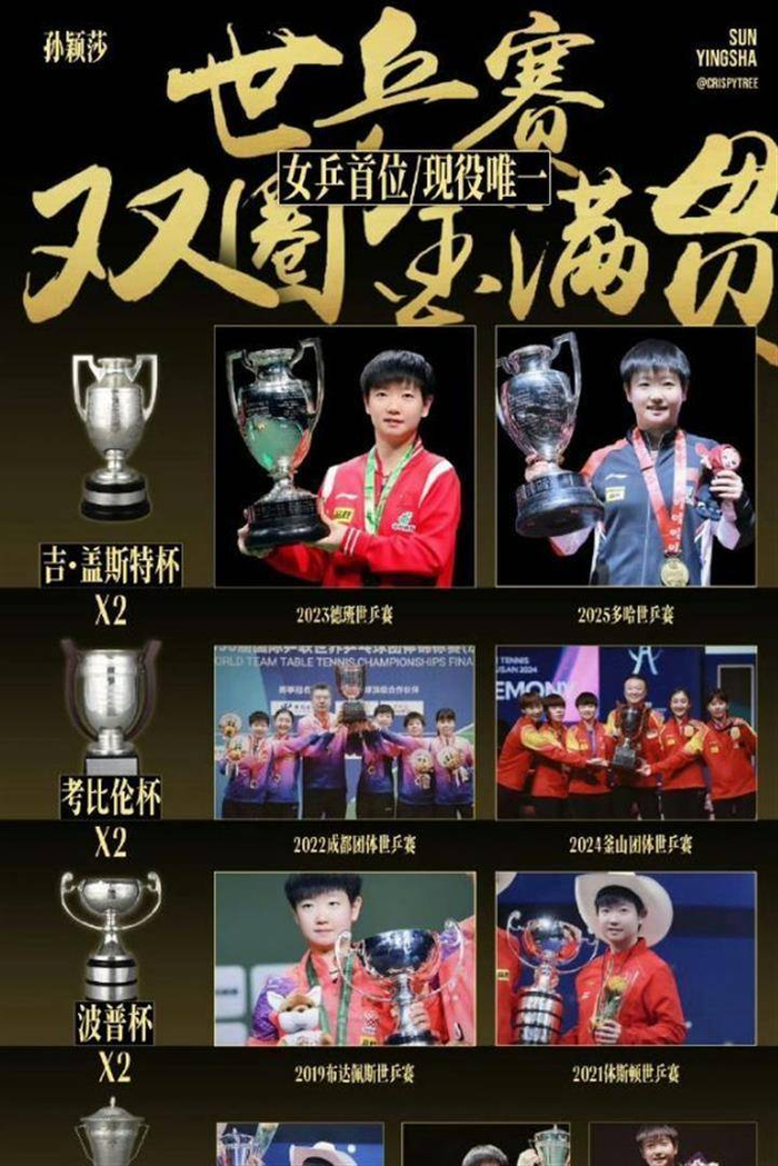 从2023年5月首夺世锦赛单打冠军,到2026年4月实现世界杯三连冠,孙颖莎在短短35个月的时间里,五次登上世界单打冠军领奖台。 她分别在2023年德班世乒赛和2025年多哈世乒赛上夺得女单冠军。 在世界杯的舞台上,她的成就更为突出。 目前,孙颖莎手握3个世界杯冠军和2个世锦赛冠军,她的三大赛单打冠军总数达到5个。 这一数字超过了现役队友陈梦和王曼昱的冠军数之和。