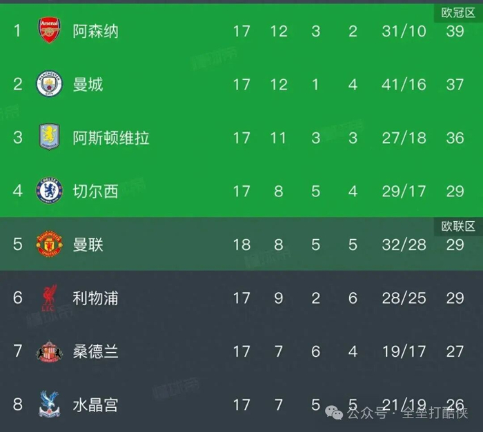 此役过后,曼联的积分来到 31 分,凭借先赛优势升至积分榜第五,与第四名切尔西同分,距离欧冠区仅有一步之遥。