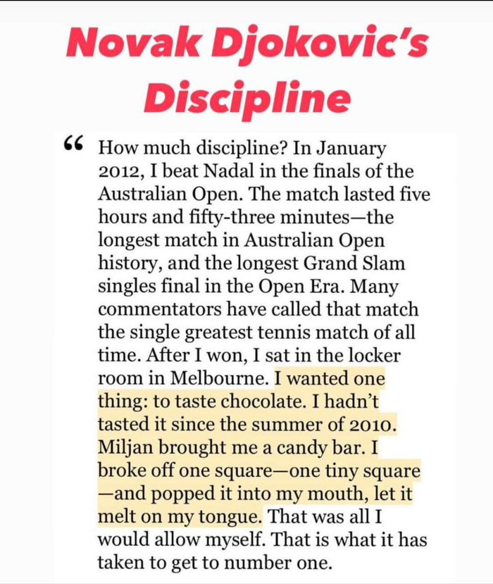德约科维奇曾在自传里写下一段令人震撼的细节:2012年澳网决赛,他与纳达尔苦战5小时53分钟。在拿下那场被称为 “史上最伟大” 的大满贯决赛后,德约科维奇坐在更衣室里只想吃一口巧克力,而他上一次吃巧克力,是在2010年夏天。教练拿来巧克力后,他只掰下小小的一角,含在嘴里慢慢融化,仅此而已。