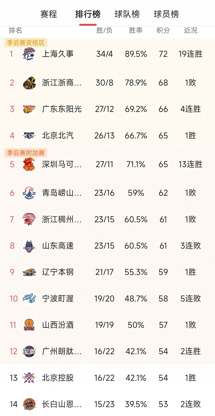 现在来看积分榜,情况就更有意思了。常规赛只剩4轮,季后赛12强的门票已确定9个席位。上海队以34胜4负的傲人战绩已提前锁定常规赛冠军,创造队史新高度。广厦队稳居第二,也没啥悬念。剩下的季后赛席位中,山西、宁波基本稳了,最后一个名额将在广州、北控和吉林之间产生。