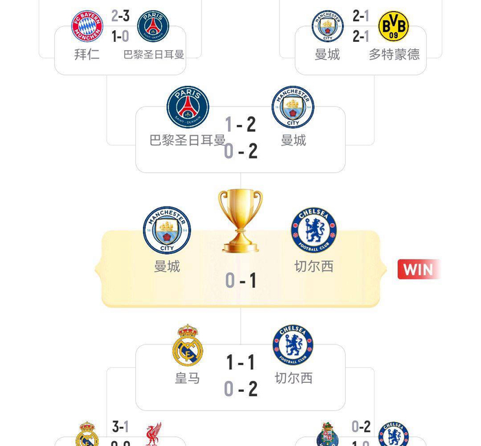 在2020-2021赛季,首回合获胜的巴黎、曼城、皇马和切尔西同样实现了晋级。