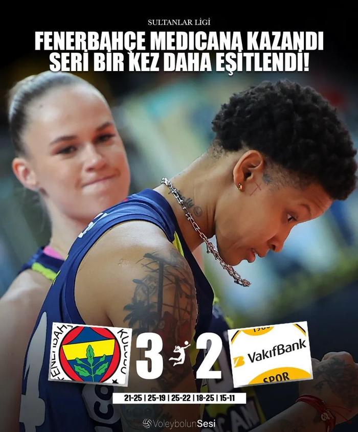 土超女排决赛第四回合巅峰对决,彻底燃爆排坛!费内巴切主场3-2(21-25/25-19/25-22/18-25/15-11)险胜瓦基弗银行,硬生生把总比分扳成2-2平,冠军悬念彻底拉满!4月19/20日凌晨,双方将迎来第五回合决胜场,谁能捧起本赛季土超冠军奖杯,一战定乾坤!