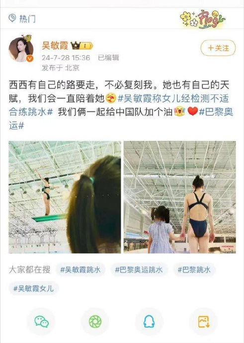 此次跳水互动背后暗藏插曲:2024年专业机构评估显示,西西的爆发力、协调性等综合评分仅60分(满分100),被判定“现阶段不适合专业跳水”。丈夫张效诚曾幽默自嘲为“奥运冠军基因破坏者”,而吴敏霞的回应彰显通透育儿观:“不必复刻我的路,她有独特天赋”。