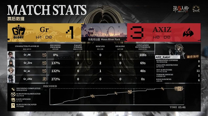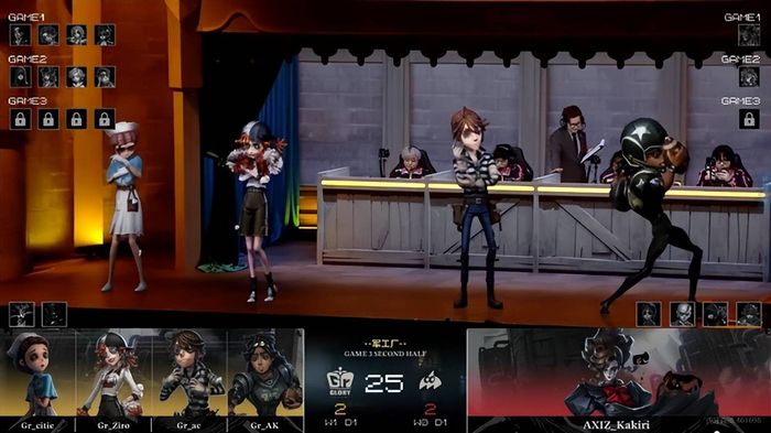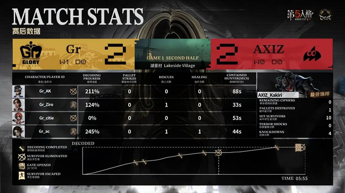 Gr的求生者选择了弓箭手、大副、木偶师、调香师;AXIZ的监管者Kakiri选择了“跛脚羊”。(BAN先知、古董商、咒术师、医生)
