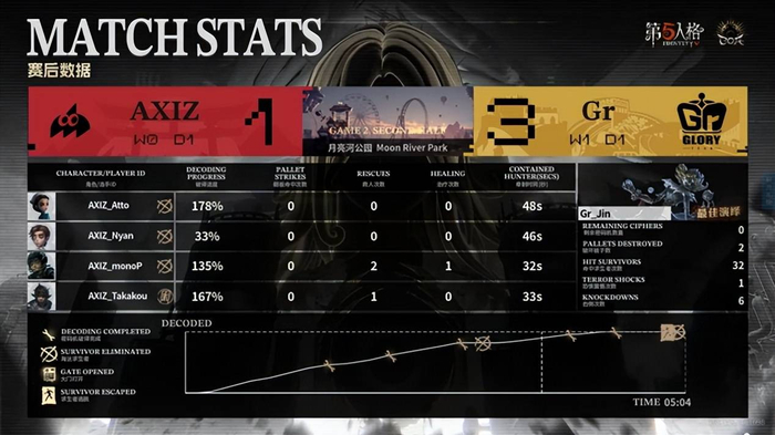 AXIZ的求生者选择了火灾调查员、气象学家、守墓人、古董商(BAN“台球手”、邦邦);Gr的监管者Jin选择了杂货商。(BAN先知、机械师、幻灯师、“囚徒”)