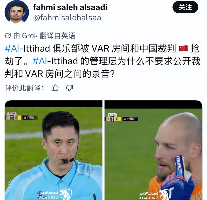 “中国裁判需要被禁止执法,他们没有资格执法任何亚洲顶级赛事!”;“应该禁止东亚裁判执法亚冠,他们嫉妒沙特联赛球队的强大,因为总是抢走他们的分数!”;“受贿且腐败的亚足联!”