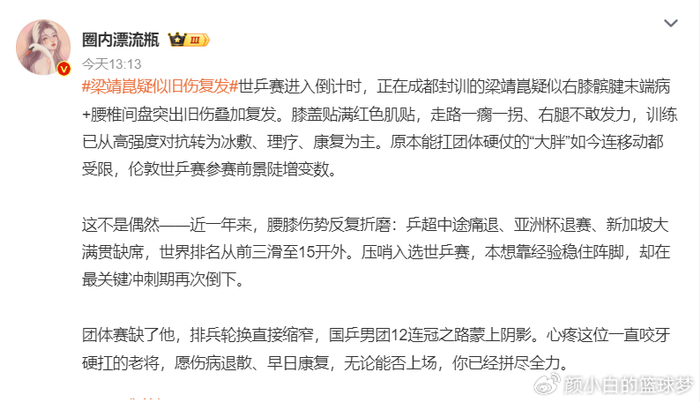 有博主写道,梁靖崑疑似旧伤复发,世乒赛进入倒计时,正在成都封闭训练的梁靖崑疑似右膝髌腱伤病+腰椎间盘突出旧伤复发。大腿贴满肌贴走路一瘸一拐,右腿不敢发力,训练已经从高难度的对抗训练转为冰敷、理疗、康复。