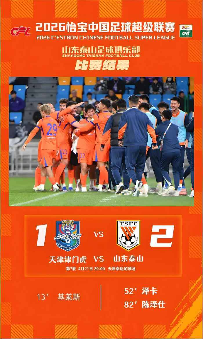中超第7轮的泰达足球场,山东泰山用一场2-1的逆转绝杀,让所有泰山球迷经历了一次从绝望到狂喜的极限过山车。上半场0射正、后防漏人、门将送礼,面对积分垫底的天津津门虎,泰山踢得像一群初次见面的陌生人。下半场泽卡头槌扳平,对手点球打飞,21岁的陈泽仕在第82分钟轰出一脚石破天惊的贴地斩——三分到手,绝杀封神。