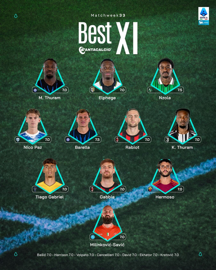 【官方】 🔴⚫️ 拉比奥特🇫🇷、加比亚🇮🇹入选#意甲联赛# 第33轮最佳阵容。👏🏻#sempremilan#